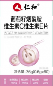 【產品名稱】葡萄籽煙酰胺維生素C維生素E片 【規格】0.6克/片*60片/盒 【批準文號/許可證號】SC11337052100315 【主要原料】山梨糖醇、麥芽糊精、L-抗壞血酸、膠原蛋白肽、全脂乳粉、維生素E(dl-a-醋酸生育酚)、煙酰胺、硬脂酸鎂、食用香精(草莓香精、薄荷香精)、葡萄籽粉、鹽酸硫胺素、核黃素、胭脂紅鋁色淀、三氯蔗糖 【用法用量】咀嚼,每日2片,不宜超量食用
